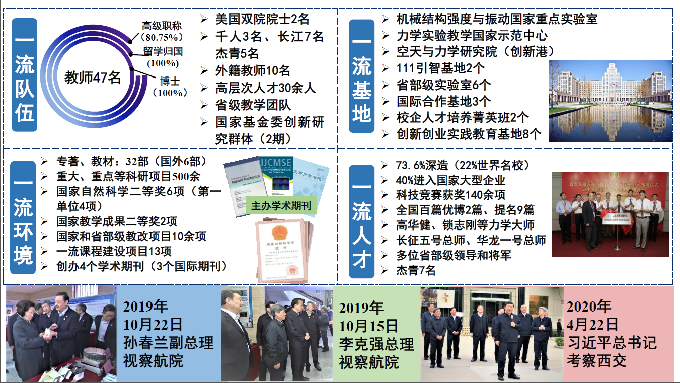 学院师资力量雄厚,拥有国际力学领域最高奖Timoshenko奖章获得者、美国三院院士、中国科学院外籍院士高华健教授,美国双院院士、哈佛大学教授锁志刚教授,国家人才计划18名。外籍教师10名;教育部教指委副主任1人、委员1人,课指委委员1人,科技委委员1人、国务院学科评议组成员1名、基金委咨询专家组成员1名。拥有一流育人环境,工程力学专业拥有机械结构强度与振动国家重点实验室、力学国家级实验教学示范中心、“111”引智基地3个,省部级实验室6个,建成2个校企合作人才培养菁英班,8个创新实验室、8个校外创新创业实践教育基地。依托国家级重点实验室和国家级基础教学平台等优势工科资源,探索力学与多学科交叉创新教育模式,培养世界一流的力学拔尖人才。2019年以来,习近平总书记、李克强总理、孙春兰副总理等党和国家领导人先后视察我校、黑料网 ,并充分肯定学院的创新成果。